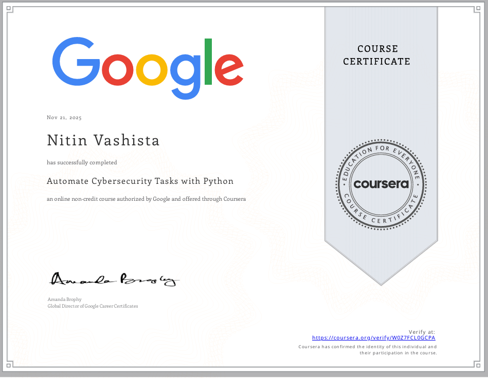 The courses completed cover key areas including Foundations of Cybersecurity, Detection & Response, Assets and Vulnerabilities, and more. These credentials demonstrate consistent learning, professional growth, and a commitment to staying aligned with modern digital standards.